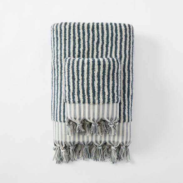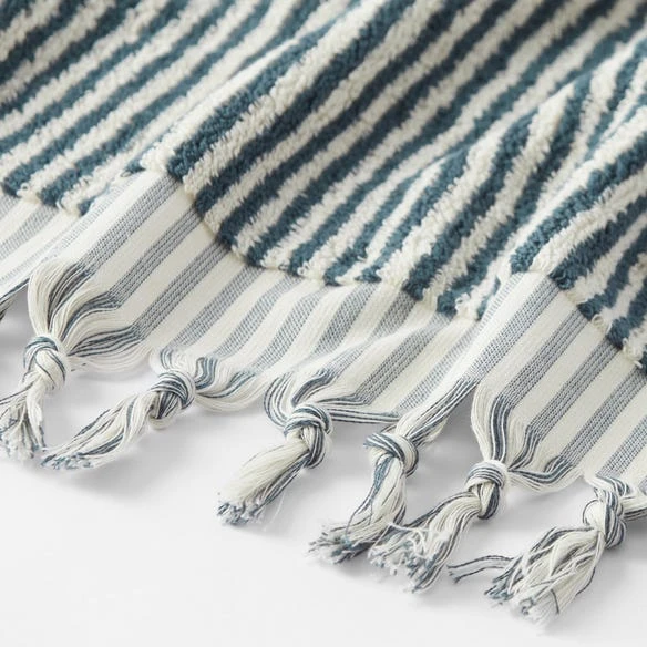 Create a contemporary bathroom style with the Ama Bath Towel in Slate and Ivory. Made from soft and absorbent cotton, this design features a yarn dye stripe with a knotted fringe detail.