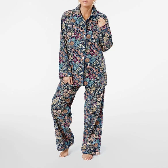 Embrace the cooler months with our snuggly Bridget flannelette pyjamas. Beautifully soft to the touch, these warm pyjamas have been crafted from cotton flannelette, brushed on both sides for extra softness. Featuring vibrant florals over a navy base, these pyjamas are the perfect winter companion. Available in three sizes, this set is complete with an elasticated drawstring waist and a button-down shirt with collar and pocket details.