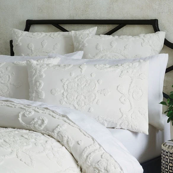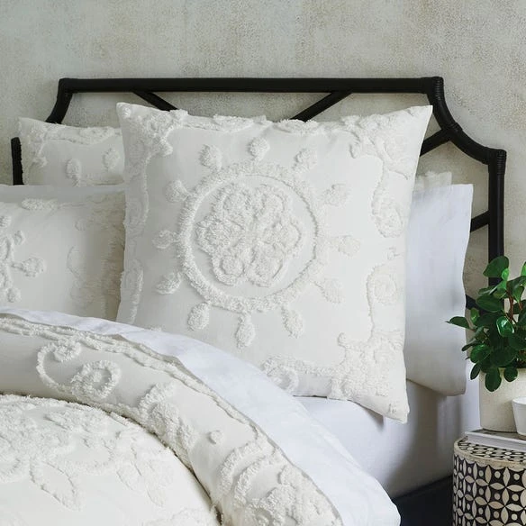 Constructed from natural cotton, the tufted chenille and medallion-inspired pattern adds texture and distinctive appeal to this white-on-white design.