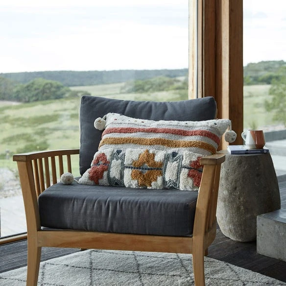 Add texture to your living room or bedroom with the Kota Tufted Cushion. Tufted patterns combine with vibrant colours and pom pom details for global style that adds a splash of colour.