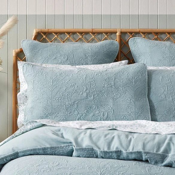 Bring a relaxed elegance to your bedroom with the Miranda quilt cover. Stone washed for extra softness and quilted for added texture, this quilt cover features a beautifully detailed floral design in a calming smoke blue. Coordinate with European pillowcases for a complete look.