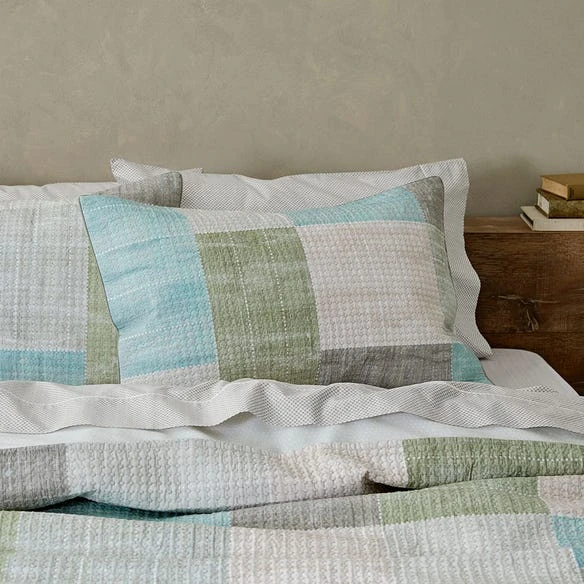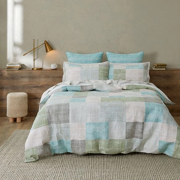 Create a contemporary bedroom style with the Mondrian quilt cover in green. Crafted from cotton percale, this design features a geometric patchwork pattern in green and neutral shades. Quilted with a small diamond stitch and finished with a filled piping trim. Coordinate with European pillowcases to complete the look.