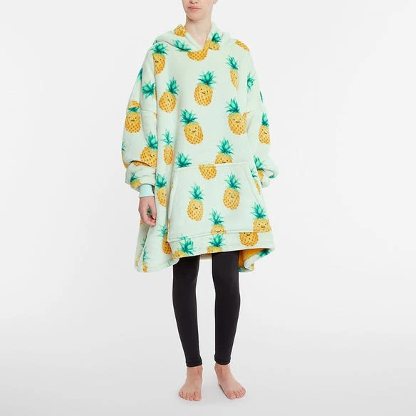 Stay warm this winter with the cosy Pineapple Hooded Sherpa. Made with a snuggly sherpa reverse, this hooded sherpa is oversized just like a wearable blanket and features smiling pineapple over a sea green base. Perfect for chilly nights at home or a great gift for someone special.