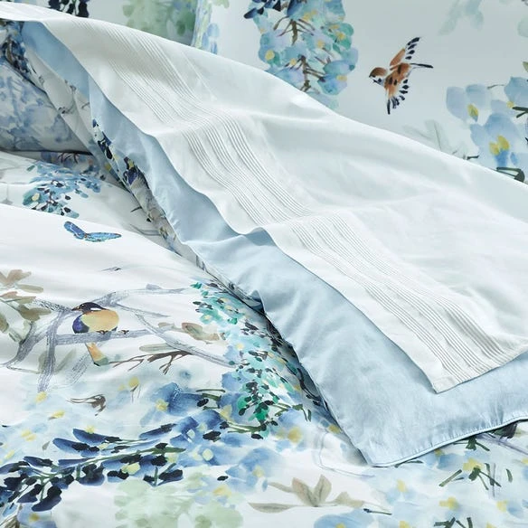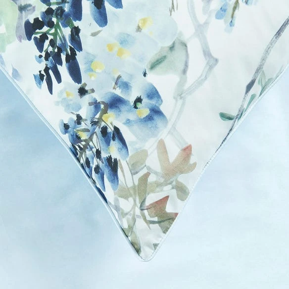 Sanderson is an internationally renowned brand in the field of interior decorating, offering quintessentially English fabrics and bed linen that draw inspiration from both traditional style and contemporary trends. A fabulous, trailing wisteria blossom design featuring beautiful butterflies and birds darting between the branches, the Wisteria Falls quilt cover will add an effortless sophistication and style to your bedroom. Printed on luxurious 360 thread count cotton sateen, this stunningly beautiful design will suit both classic and contemporary styles. Coordinate with the matching pillowcases to complete the look.
